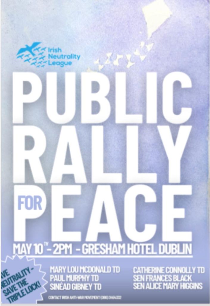 Cross-party Oireachtas members of the INL today announced details of a major Dublin event to promote peace and neutrality on 10th of May. The ‘Public Rally for Peace: Save the Triple Lock – Save Neutrality’ is taking place at 2PM in The Gresham Hotel on May 10th and will include speakers from across the opposition parties and independent Parliamentarians. There will be music and performances from Lisa O’Neill and other artists.